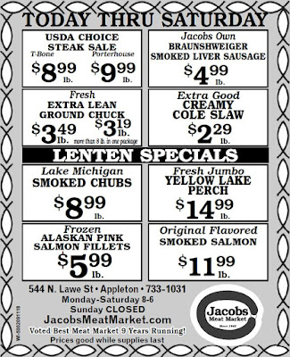 pretty-well known for those specials for both the great prices as well as the Quality Seafood! This week, we are starting out with Fresh Yellow Lake Perch! None of that imitation stuff...just the old fashion Lake Erie Lake Perch! Not farm-raised, never frozen...almost like all you fishermen out there...minus the gassing the boat up and baiting the hooks and cleaning the fish! :) Along with the Perch, we have Lake Michigan Smoked Chubs and Wild Alaskan Pink Salmon and Original-flavored Smoked Salmon pieces and sides. Speaking of sides, we have our Creamy Cole Slaw on sale too! If you're not in the seafood mood, we also have Great "Meat" items including Fresh, Extra Lean Ground Chuck (our #1 sale item), T-bones and Porterhouses, and our Jacobs own Braunschweiger!